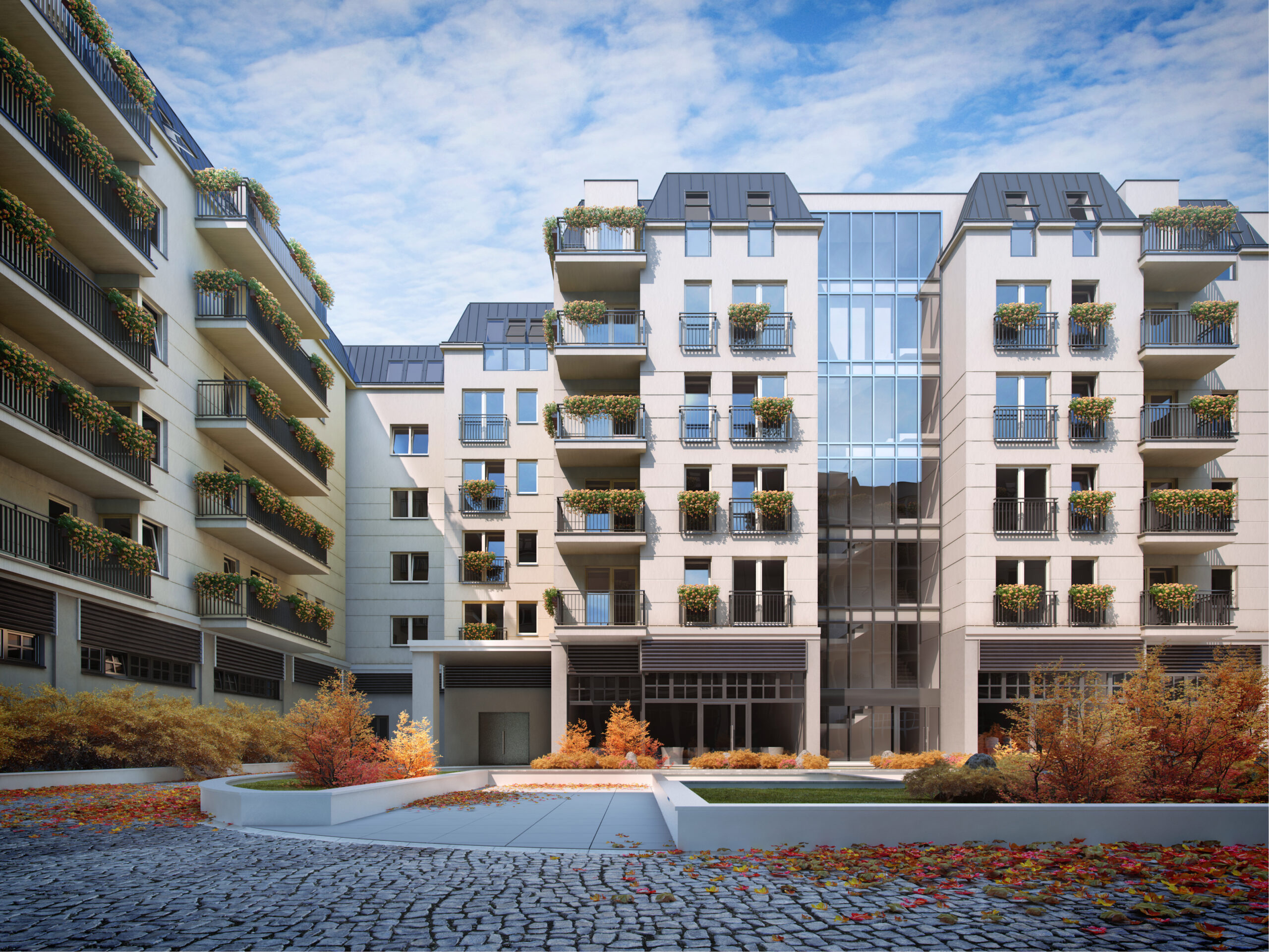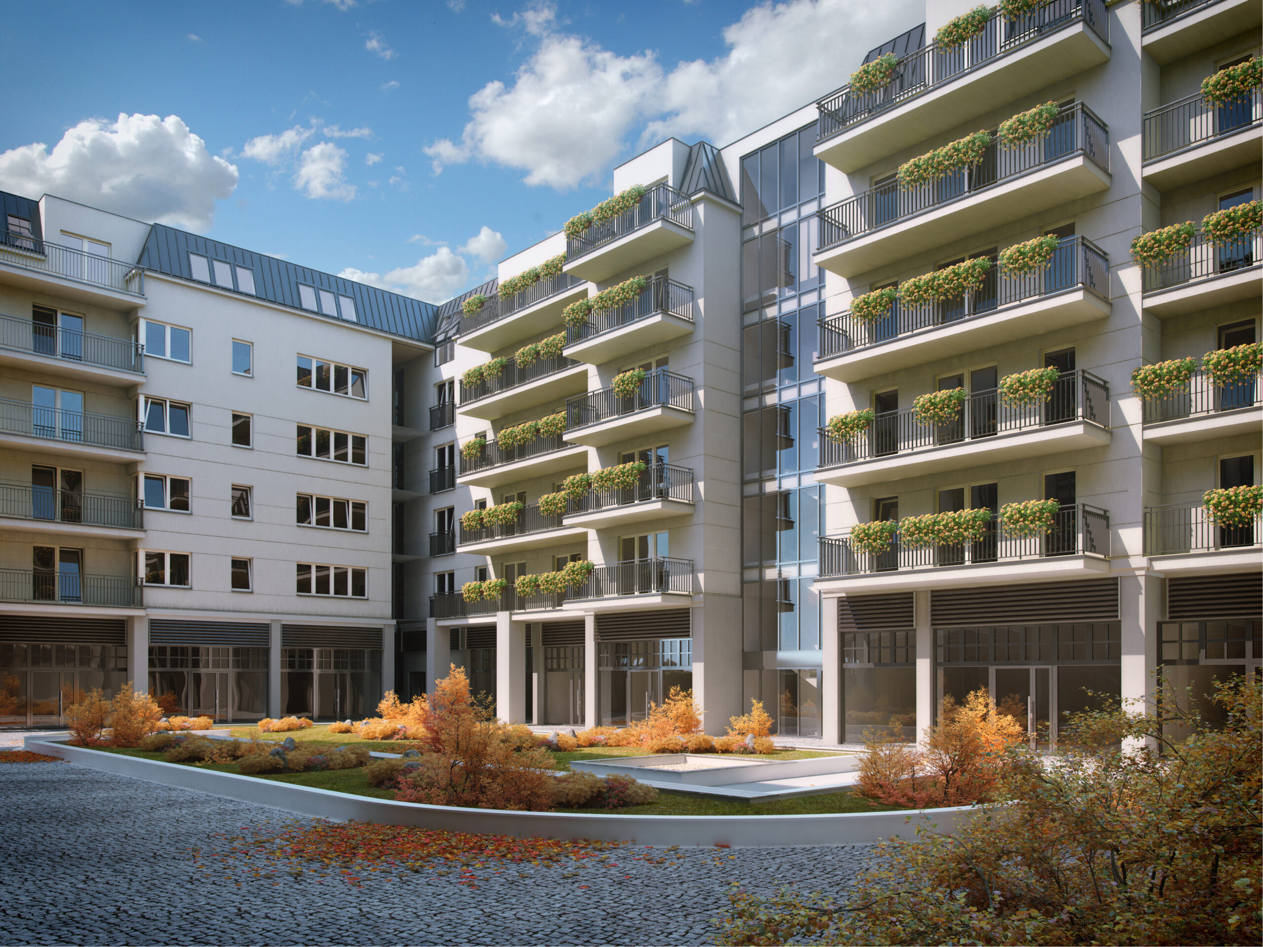 Wewnętrzna część kompleksu to część mieszkalna, która tworzy przestronne atrium. Składa się ona z 5 segmentów, które oferują różnorodne opcje mieszkaniowe. Na 5 kondygnacjach znajdują się 160 mieszkań o powierzchni od 26 do 90 m², które zapewniają komfort i funkcjonalność. Na parterze zlokalizowano dodatkowo 6 lokali handlowo-usługowych, które otwierają się na obsadzone zielenią patio, tworząc przyjemną przestrzeń dla mieszkańców oraz odwiedzających.