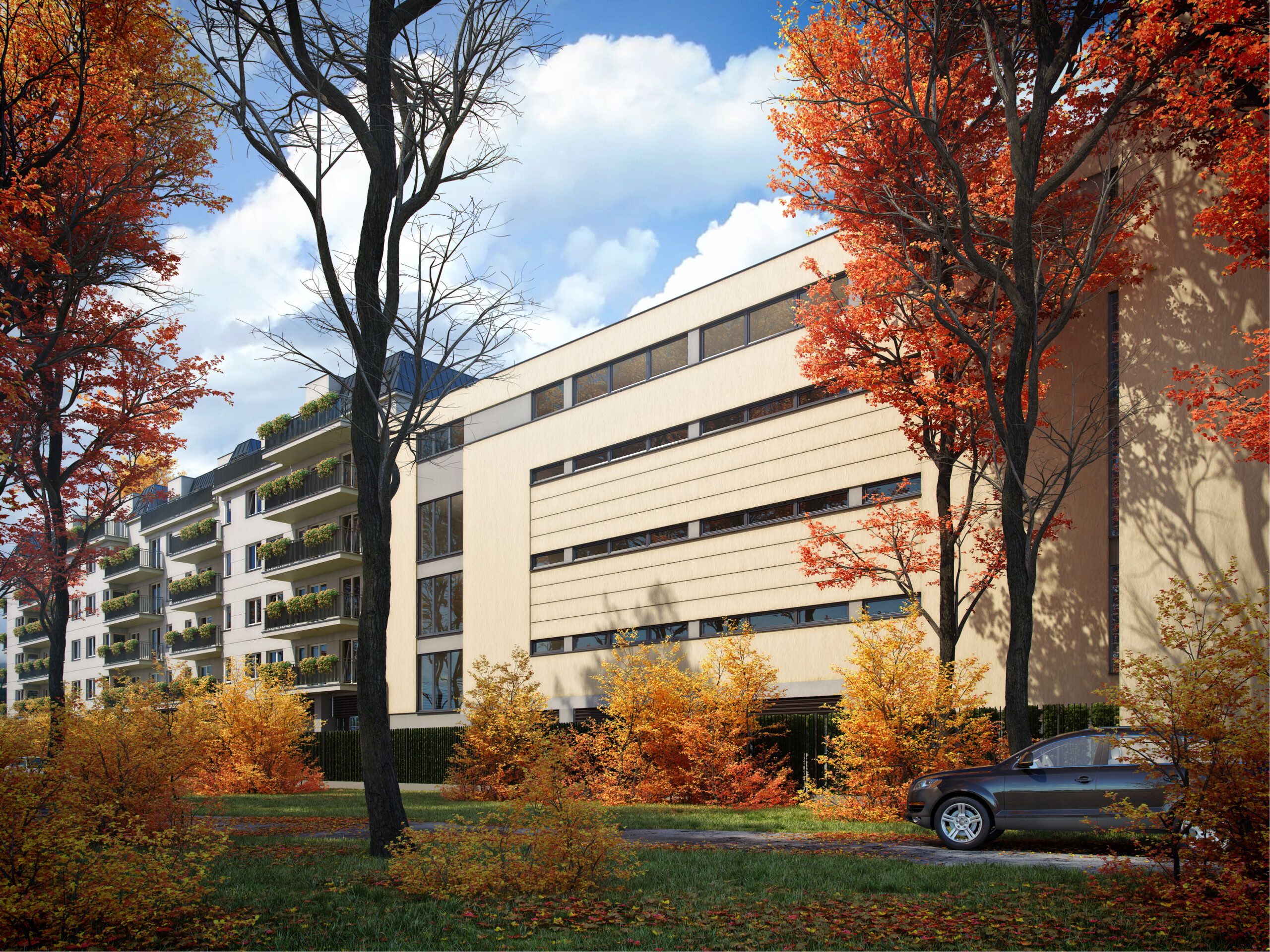 Od frontu, przy głównej ulicy, wzdłuż secesyjnych kamienic, wyróżnia się awangardowy budynek biurowy. Jego reprezentacyjna elewacja, łącząca szkło z kamieniem, stanowi nowoczesne nawiązanie do historycznego kontekstu, zachowując jednocześnie współczesną elegancję. Budynek ten, liczący 6 kondygnacji, oferuje 1440 m² powierzchni biurowych klasy B+ oraz lokal handlowy na parterze, który wprowadza dynamiczny element do tej prestiżowej lokalizacji.