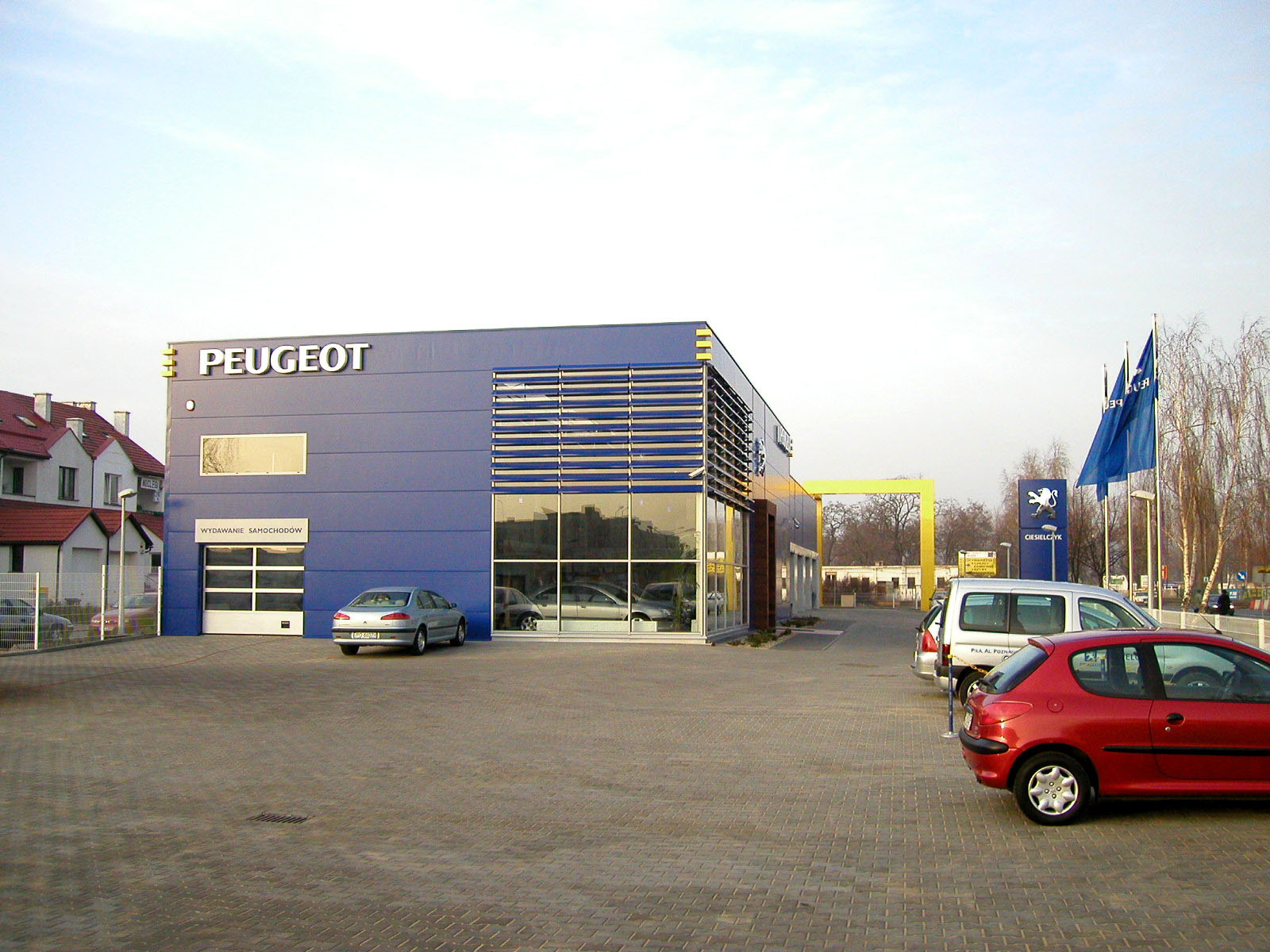 Charakterystycznym elementem architektonicznym budynku są dwa wyraźnie zaakcentowane narożniki. W jednym z nich umieszczono imponującą fasadę, która przyciąga wzrok i podkreśla nowoczesny charakter obiektu. W drugim narożniku zainstalowano trójwymiarowy portal, który w rzucie przypomina literę „L”. Ten efektowny portal nie tylko wyróżnia się estetyką, ale także nawiązuje do formy i materiałów użytych w głównym wejściu do salonu. Okładzina drewniana na portalu harmonijnie współgra z designem, tworząc spójną i elegancką kompozycję, która odzwierciedla wysoką jakość i nowoczesność oferowanych usług.